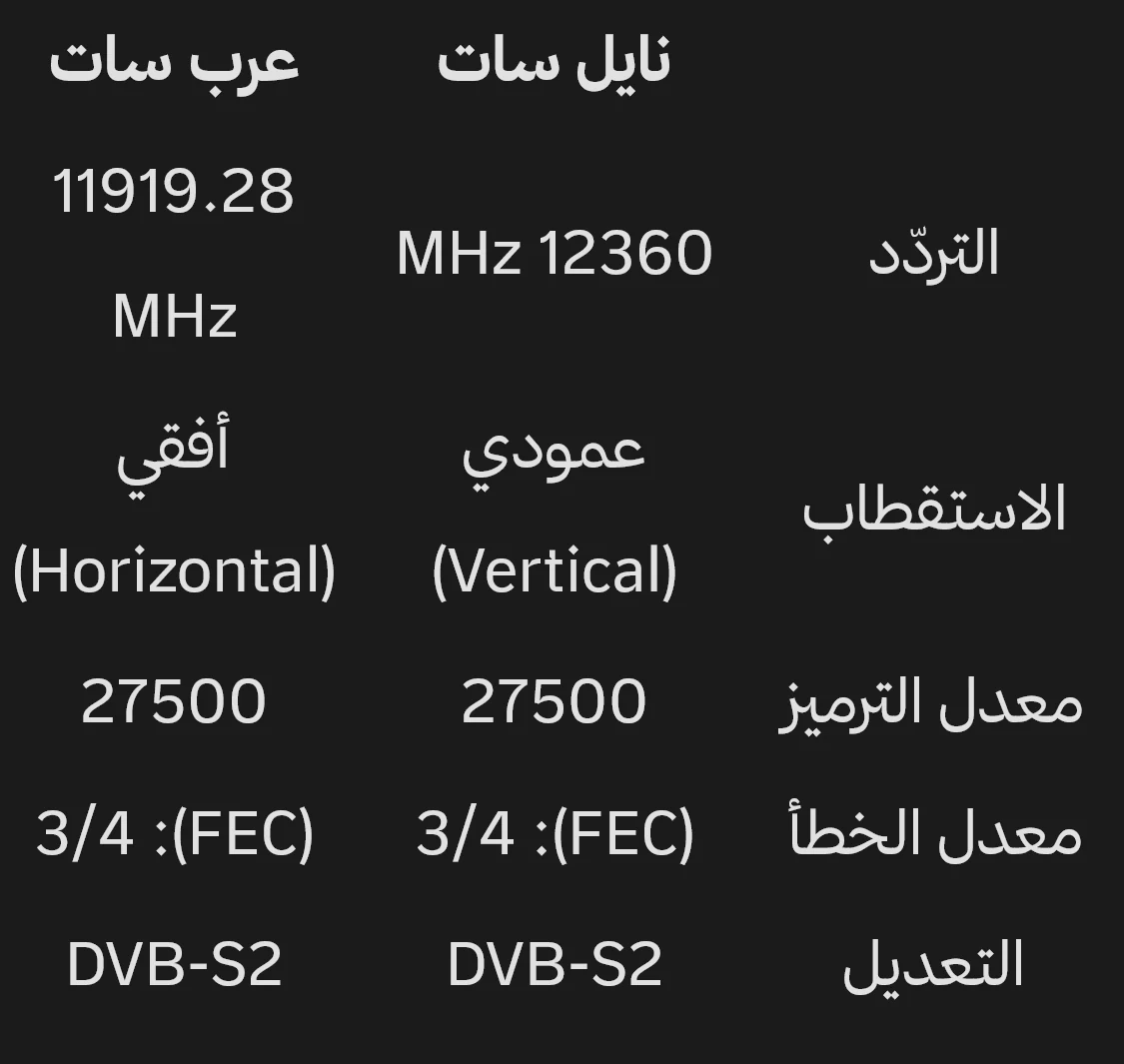 القمر الصناعي التردد الاستقطاب معدل الترميز معامل تصحيح الخطأ الجودة