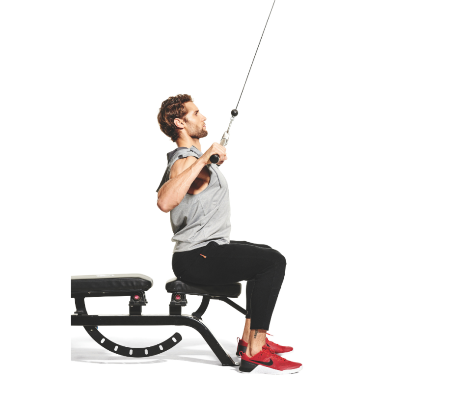 - Sit on a pullover machine and grab the bar with an overhand grip, pushing elbows into the pad.