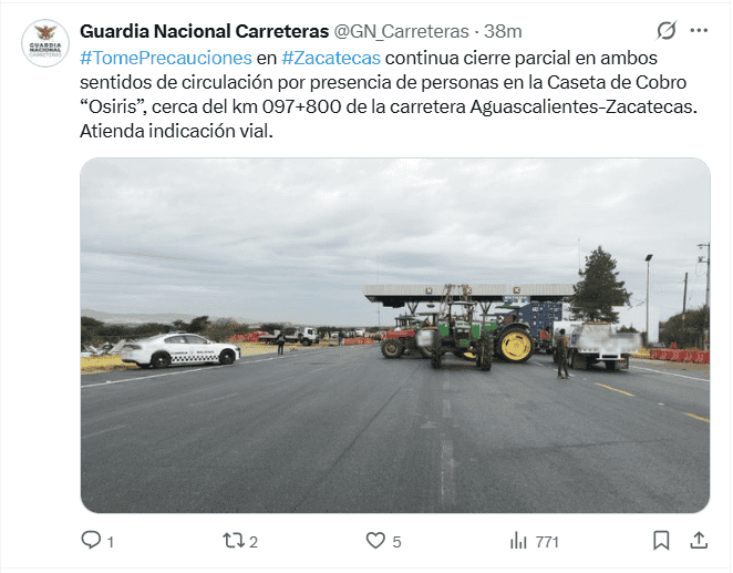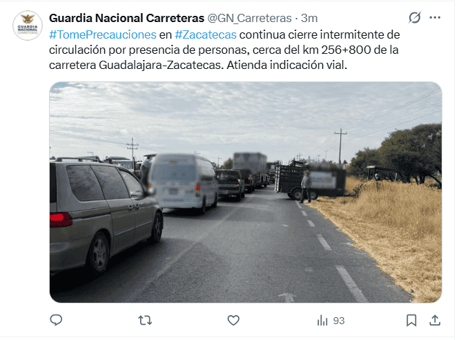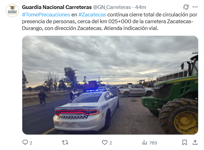 - Continued total closure of circulation due to the presence of people, near km 025+000 of the highway Zacatecas-Durangowith direction Zacatecas.