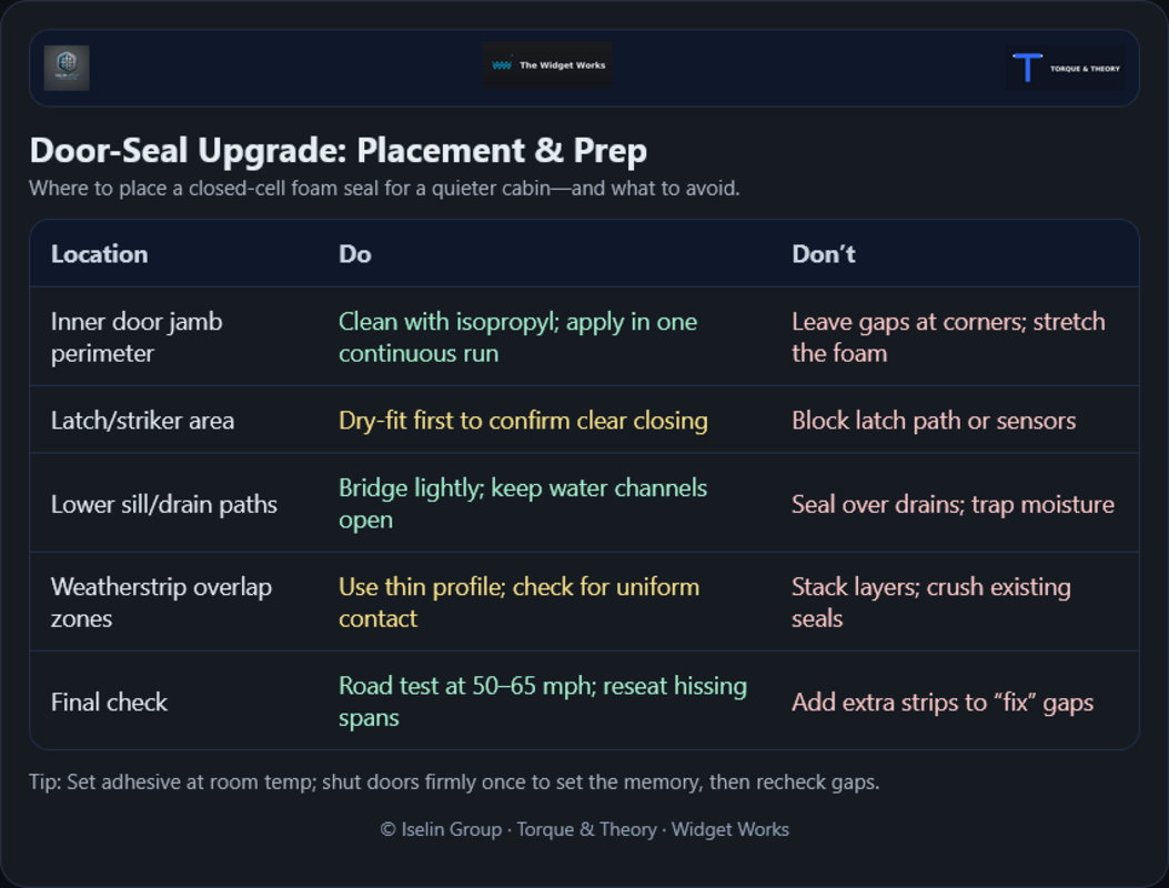 Install in one continuous run. Close each door firmly and take a short highway loop. If a span still hisses, lift that section and reseat—don’t double-stack foam. Expect a “volume 10 to 8” change: not magic, but enough to make podcasts clearer and conversation easier.