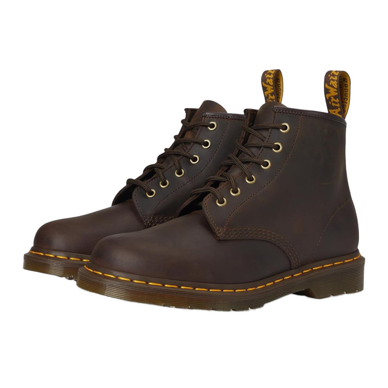 The upper is finished with brass eyelets, and the six-eye lace-up design gives you a snug fit for all-day wear. The 101 is slightly shorter than other classic Dr. Martens models, which makes it more comfortable to wear for those with shorter legs (or anyone who prefers a boot with a lower shaft height). The upper is also heat-sealed to the sole and stitched with Goodyear welt, which gives it good durability and also an instantly recognizable look—the yellow stitching is a Dr. Martens hallmark. The boot rides on a Dr. Martens air-cushioned sole for a flexible, comfortable feel.