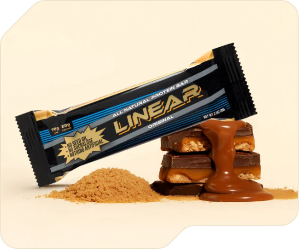 The Linear Original Protein Bar has “a world of flavor inside” with a chewy nougat center, buttery caramel on top and a coating of organic dark chocolate. Taste testers say they come off as more of a candy bar than a protein bar, which is inspiring them to leave reviews like “I used to dread protein bars and now I crave them,” and “This is the only bar I’ve tried that keeps me full and actually tastes good.”