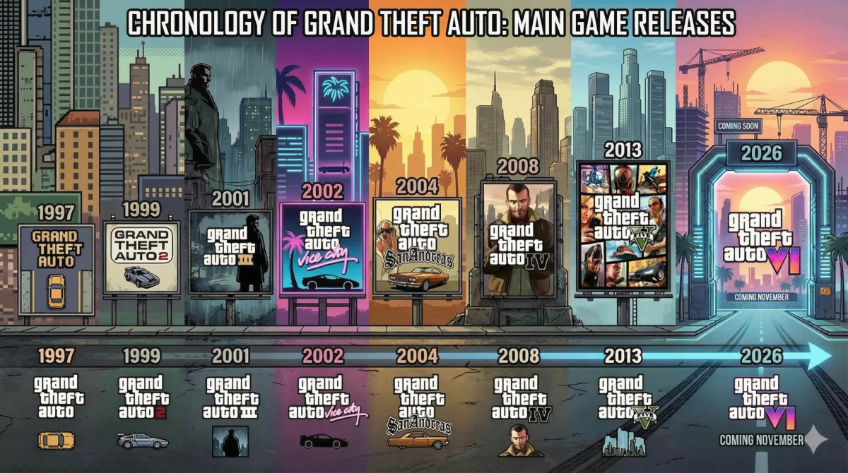 A graphic showing the breakdown of the ‘Grand Theft Auto’ franchise by the year each game was released.