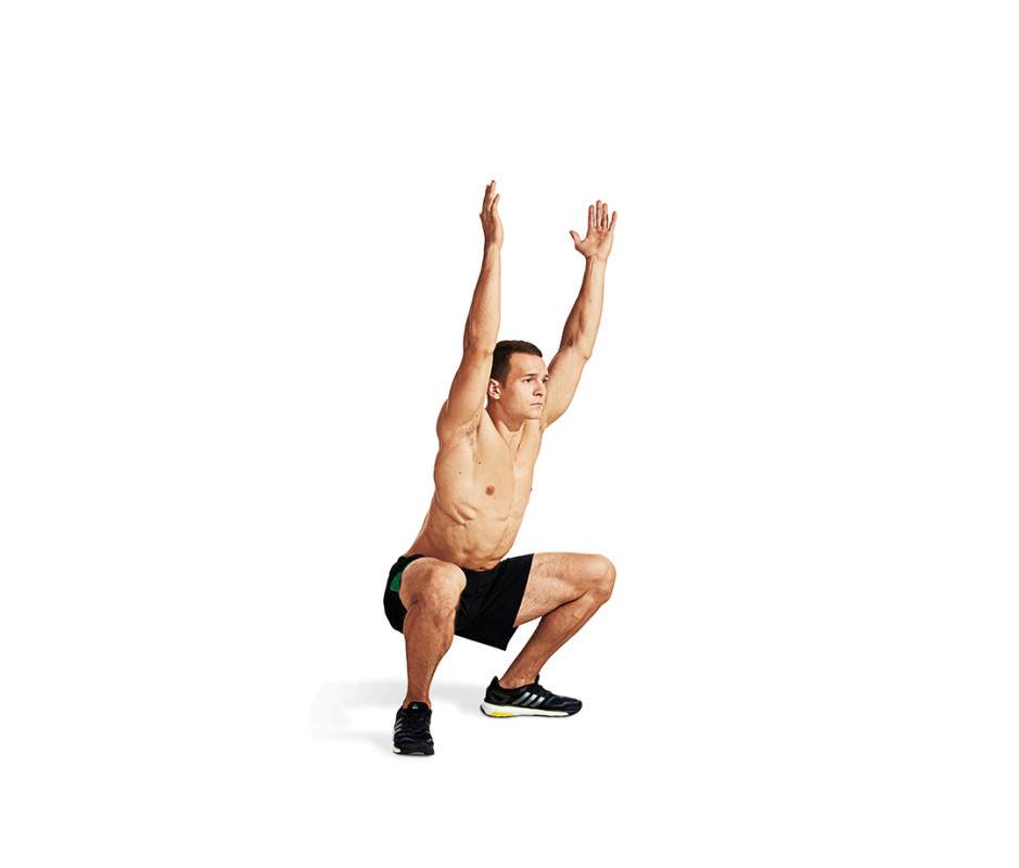 - Activate your core and lower into a deep squat, maintaining a tall chest.