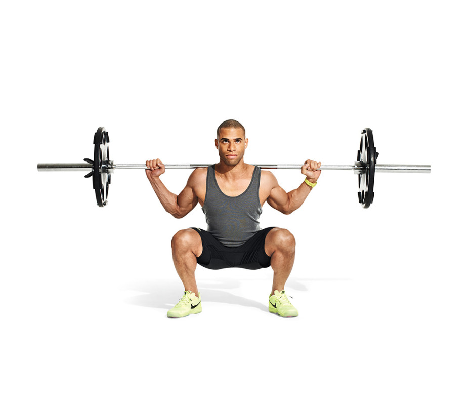 - Keep your chest tall as you lower into a squat by bending your knees and pressing your hips back.