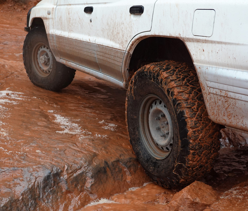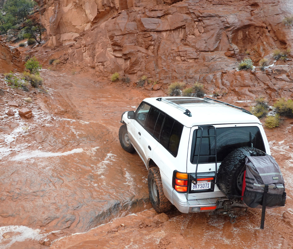 The first day, I aired up to 44 psi for better fuel economy on the long drive from L.A. to Southeastern Utah, then deflated down to 22 psi when I reached the first trail. At lower pressure, as I ripped up a winding mountain ride rally-car style, the improved smoothness blew my mind. Of course, the Montero was not really made for this, and felt a little tippy. It also can’t drift under power, even in two-wheel drive. But the KO3s also provided so much traction that I felt the truck starting to lean a bit too much for safety before the tires lost any grip and started sliding. Impressive, to say the least.