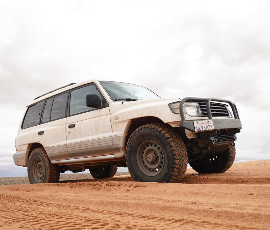 My truck probably represents more of a typical use case than the Ranger Raptor, a mildly built 1998 Mitsubishi Montero that weighs in the ballpark of 5,000 pounds thanks to a set of thick stainless steel engine and transmission skid plates, Toyota FJ Cruiser “steelie” wheels, and a sleeping platform built inside for budget-style overlanding. Due to early tire size availability, the KO3s arrived in a slightly larger diameter and width than I wanted. Luckily, I recently re-geared my front and rear diffs to 4.90s versus the stock 4.27s, which made stepping up to 33-inch tires a lot more appealing.