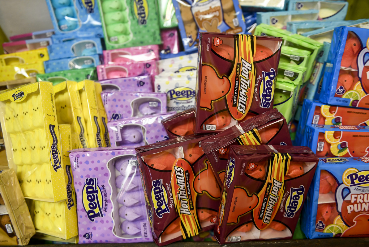 A display of marshmallow Peeps in a variety of flavors and collaborations from a previous year’s Easter selection.