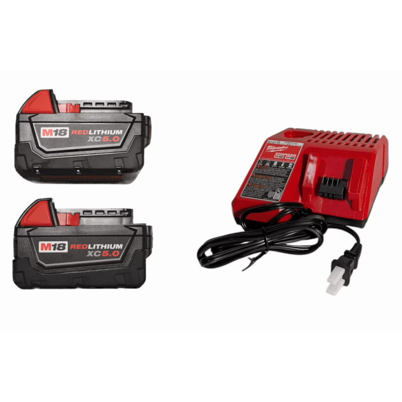 This kit includes two batteries and a charger. The batteries are Milwaukee’s heavy-duty M18 Redlithium XC variety, and they’ll work with any tool in the M18 lineup (which includes over 250 power tools). At 5Ah each, the batteries offer excellent runtime, and they’re built tough to withstand drops, bumps, dust, and other worksite hazards.