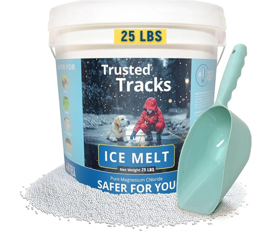 SnowJoe Premium Enviro Melt is a magnesium chloride- and calcium magnesium acetate-based ice melt works in cold temperatures of up to -10 degrees Fahrenheit (F). Although it does contain sodium chloride, the company states it is safe for concrete, vegetation, and metals when applied properly. The formula provides quick and fast results, starting the melting process as soon as it comes into contact with the snow. Plus, it enhances traction, and the calcium chloride crystals provide up to 24 hours of de-icing. According to the manufacturer, when applied correctly, you don’t have to worry about tracking it inside your home, as it won’t stick to your shoes.