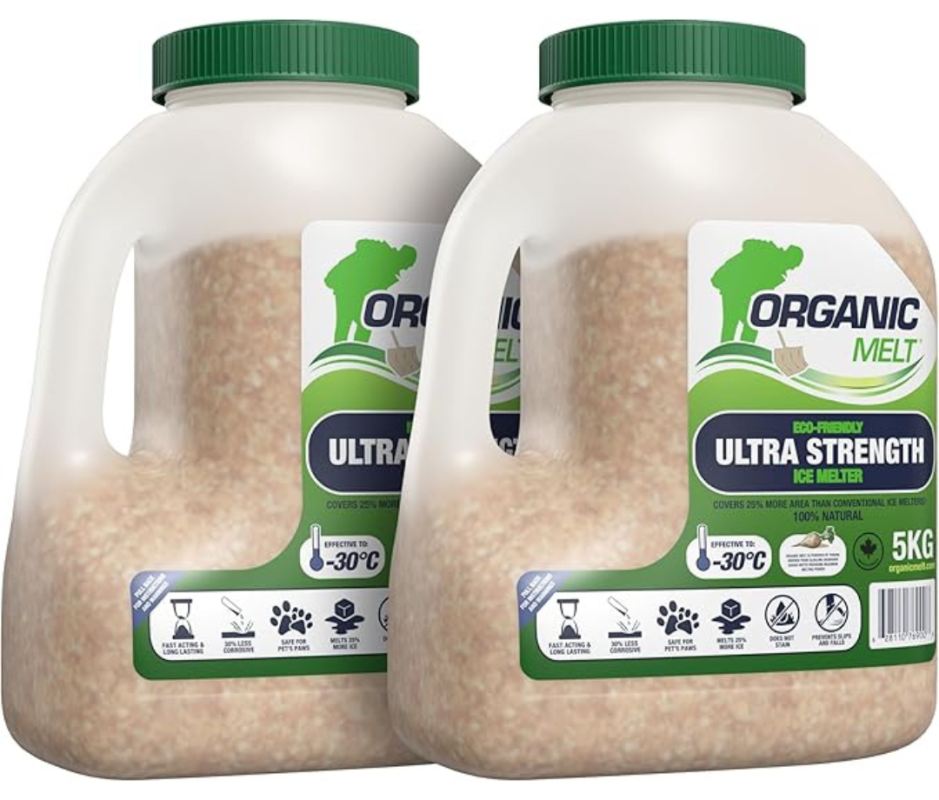 Conveniently packed in a shaker jug for easy application, Organic Melt isn’t only safe and effective for your concrete, but it is also eco- and pet-friendly. Containing sugar beet as the base ingredient, it’s a safe option for wood, decks, landscaping, and concrete. This eco ice melt works in temperatures as low as -30 degrees Celsius, making it a great option for areas with extreme freezing temperatures. Organic Melt is a good choice for homeowners with small walkways and sidewalks, as it is pricey.