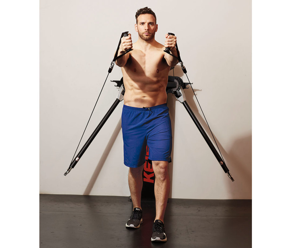 - Press one handle upward while keeping the other arm bent, focusing on contracting your upper chest.