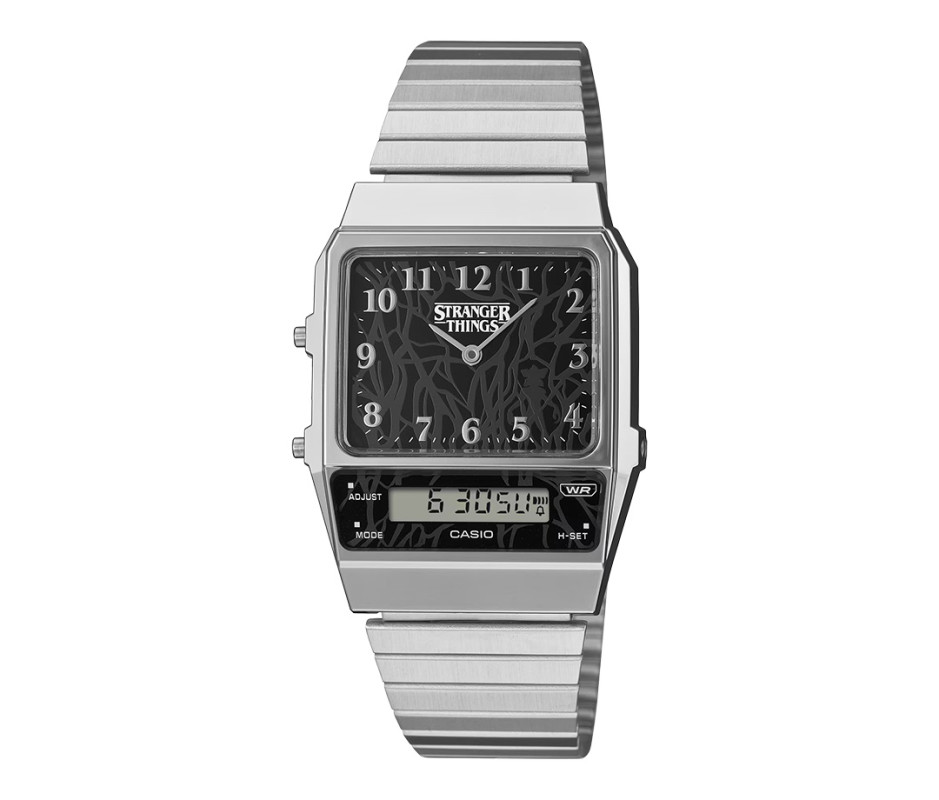 The analogue-digital hybrid Casio Vintage AQ-800EST-1A also gets the Vecna treatment both on the square dial and around the digital display. The applied metallic indexes are rendered in the distinctive Stranger Things typeface and the show’s logo is also printed just below 12 o’clock. The case back is engraved with the Stranger Things logo (as is the G-Shock model), while the stainless steel bracelet clasp cover bears the number “001”—the tattoo seen on Vecna’s wrist.