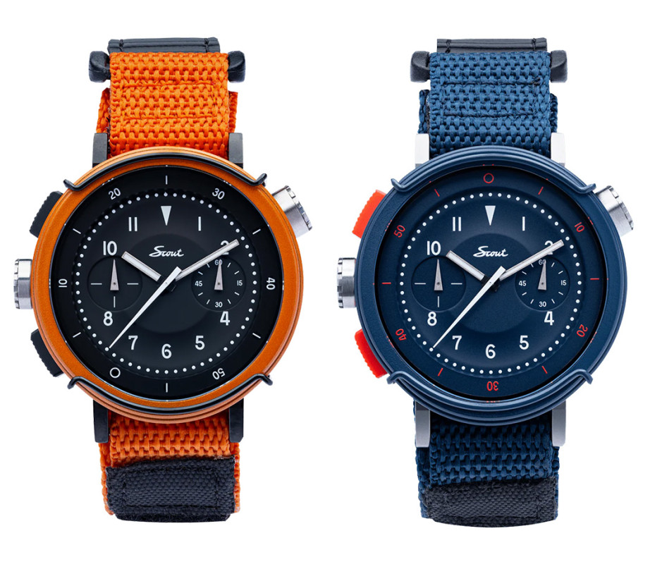 The Moonstone Blue’s navy case serves as an homage to the OG color code 6606 of the same name, which dates back to 1965 and the Scout 80. The matching dial is accented with bright red pushers and bezel markings for functionality and a design flourish. A blue, woven textile, velcro strap builds on the utilitarian look and feel.