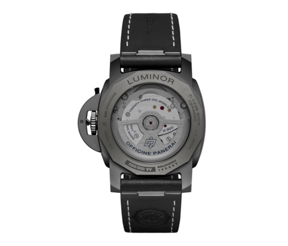 Inside the ceramic, the PAM01460 is powered by the automatic P.900/GMT movement with a three-day power reserve. Visible through a smoked sapphire crystal open case back, the caliber is equipped with a stop-second function for setting against a reference time. The GMT complication uses a 12-hour display, a throwback to some of Panerai’s earliest dual-time models.