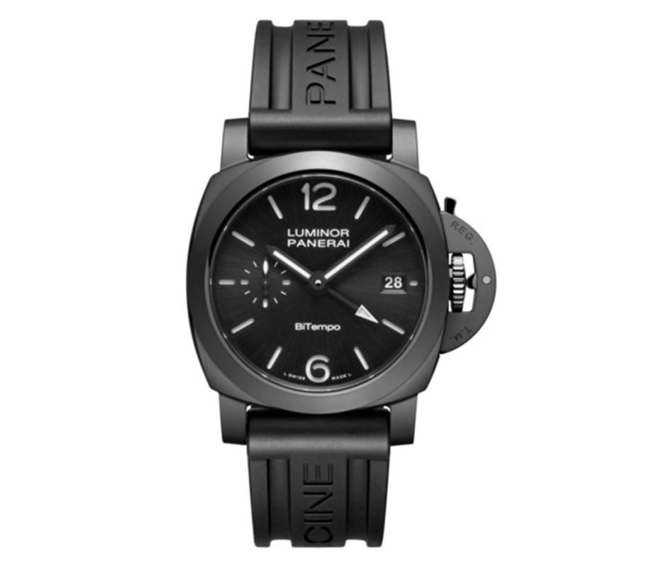 Black on black on black, this Luminor is stealthy and sleek. The matte ceramic case is naturally lightweight and highly resistant to corrosion and scratches. The cushion case design features Panerai’s hallmark edges and lever-locked crown guard.
