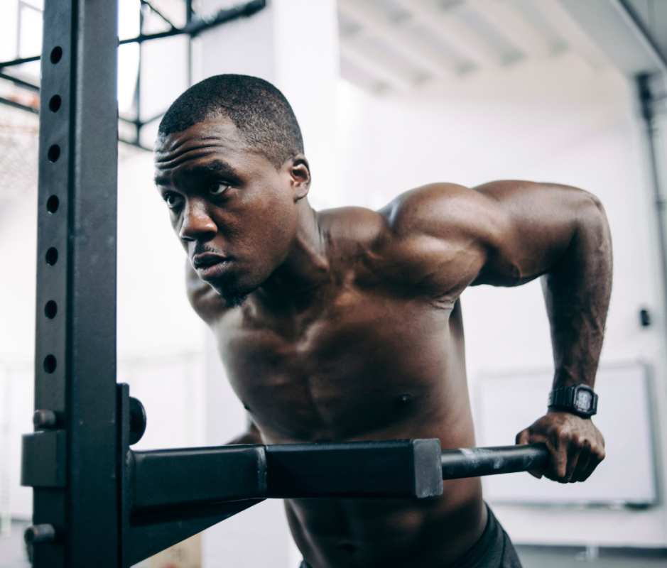 Whether using a bench or parallel bars, keep your elbows close to your torso to maximize triceps activation. This move targets the triceps while also engaging the shoulders and chest for a well-rounded upper-body workout.