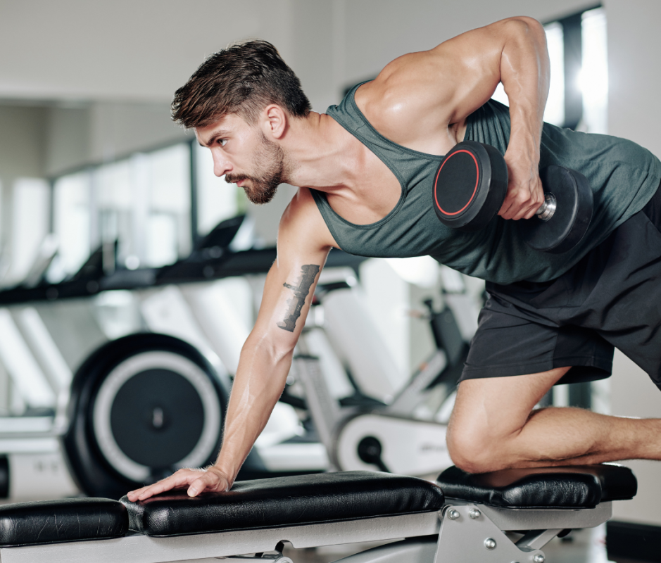 - Place your left knee and hand on a bench, holding a dumbbell in your right hand.