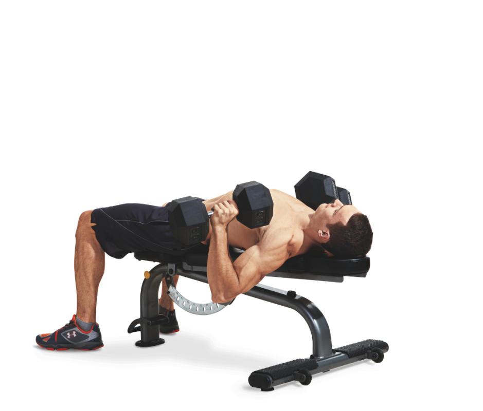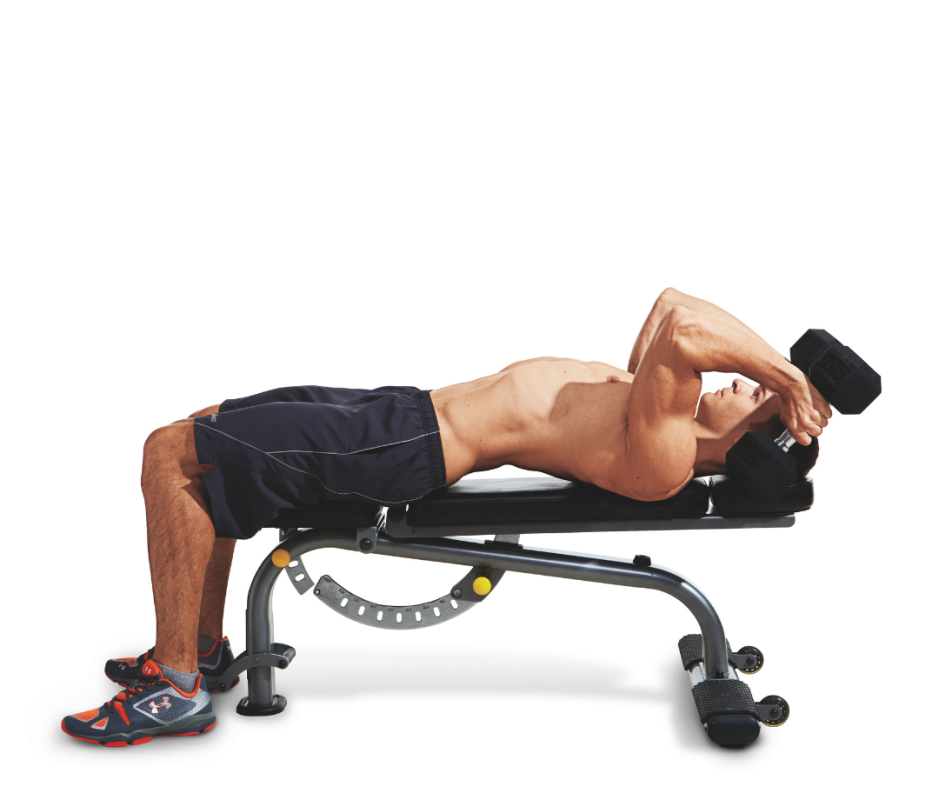 - Lie on a bench holding dumbbells at chest height.