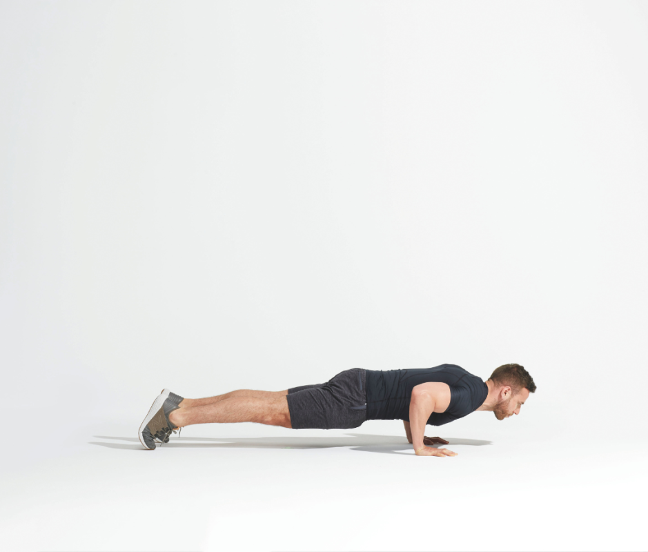- Place hands shoulder-width apart on the floor in a high plank position, keeping your body in a straight line from head to heels.