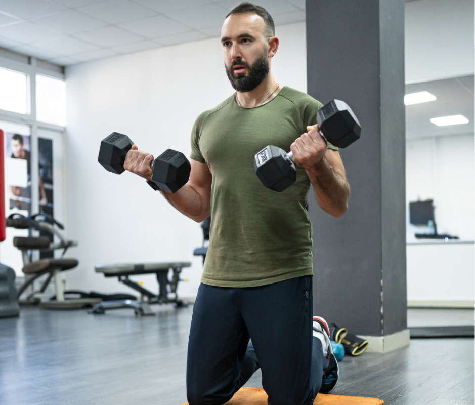 - Kneel on both knees, holding dumbbells at your sides.