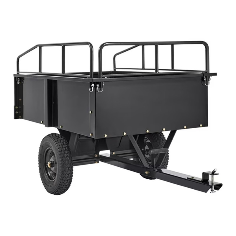 This Bentism Dump Trailer is made with a heavy-duty iron body and thick wheels with deep grooves and a pneumatic shock absorption system for all-terrain movement. Its basin is fully enclosed, is strong enough to hold 750 pounds, has a removable rear panel, and has thick side panels to secure your load better.