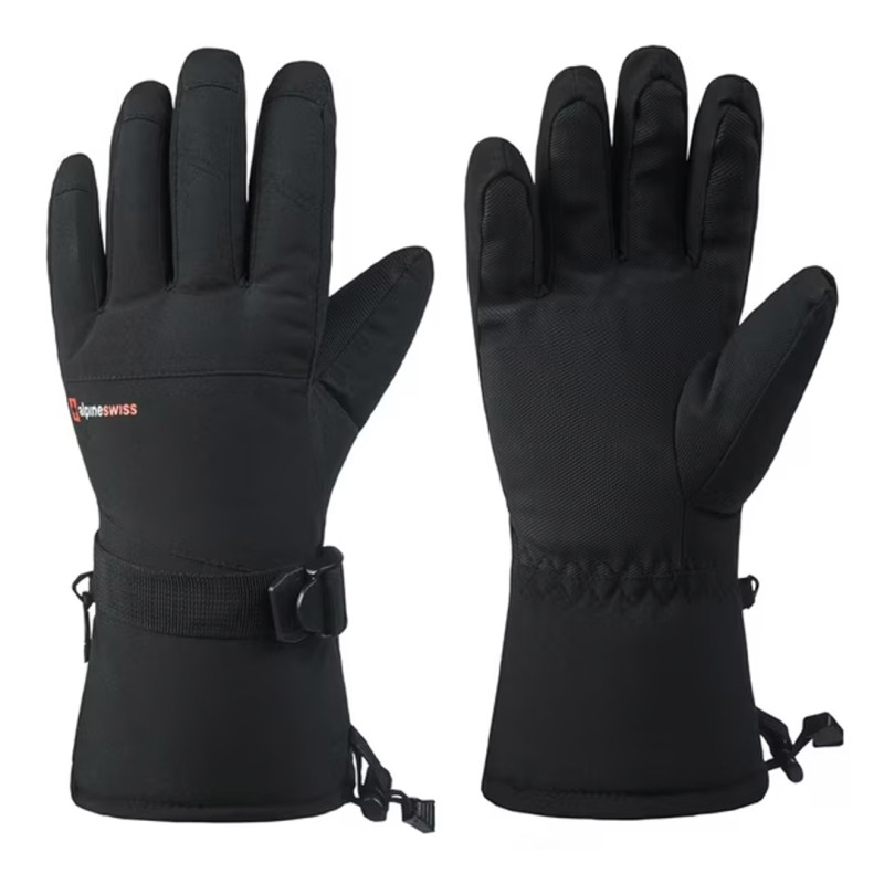 These Alpine Swiss waterproof gloves are designed for snowsports as well as casual wear in demanding winter conditions. Starting from the outside, they feature a durable shell material made from 150-denier polyester that resists water and wind, and the palms are lined with a TPU material for extra grip—ideal for holding onto ski poles or a snow shovel.