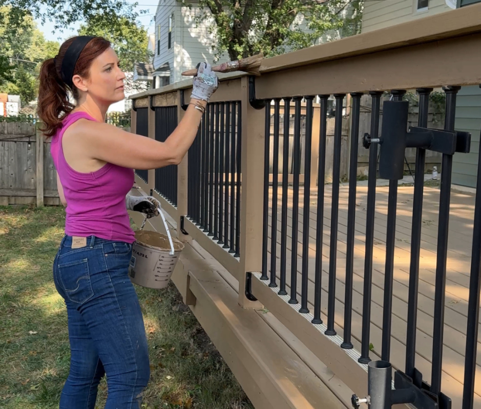 After you choose the deck stain or sealer, you’ll need a gallon per 250 square feet. Just don’t forget to factor in the vertical elements that you plan to stain when estimating the number of gallons. You’ll also need something to stir the stain. We use a drill attachment, but you can use a stir stick if you are thorough. You’ll also need an applicator. While deck pads are recommended by some deck stain brands, we prefer brushes and use a four-inch deck brush for the decking and a smaller brush for the details. We also wear gloves when applying the stain.