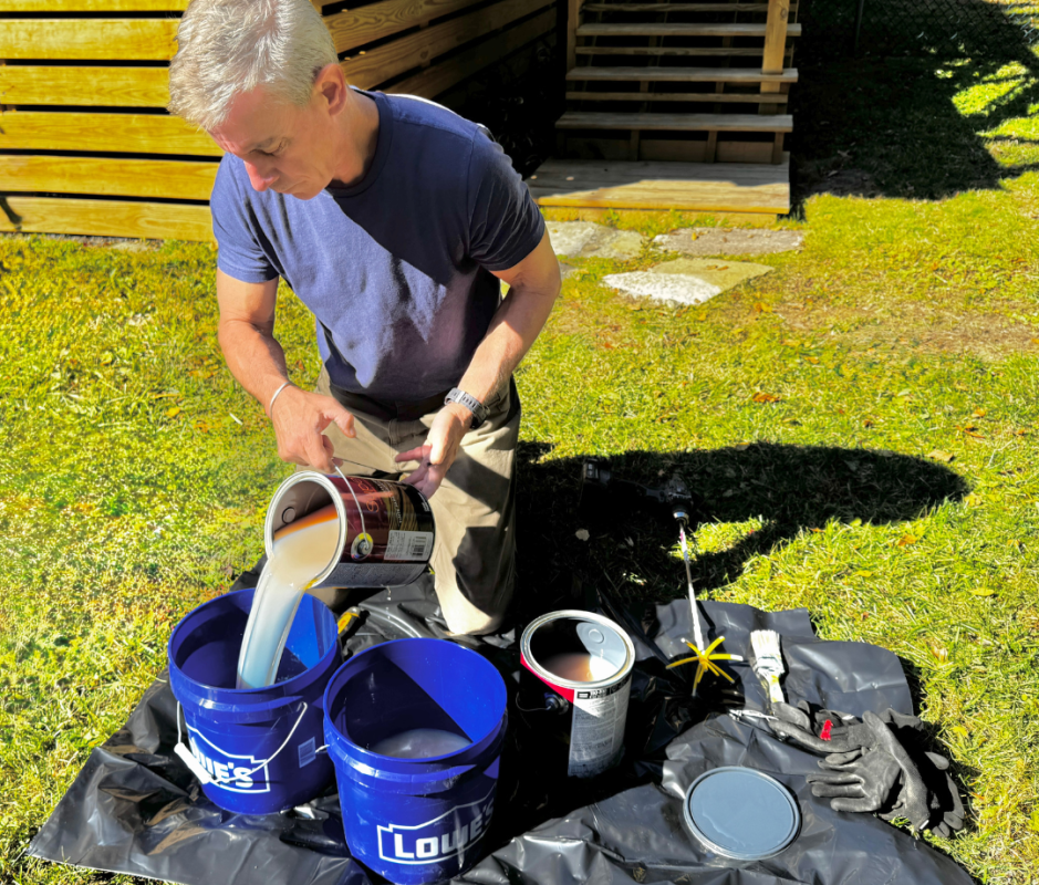 Stain needs to be stirred before using. You can use a paint stirrer or a stir attachment with a drill to thoroughly mix the stain in the cans. For a small deck that just requires one gallon, you are ready to use the stain after stirring. For larger decks that require multiple cans, we recommend mixing stain from multiple cans into another bucket. This way, if there are any color discrepancies between the cans of stain, they will be blended prior to application.