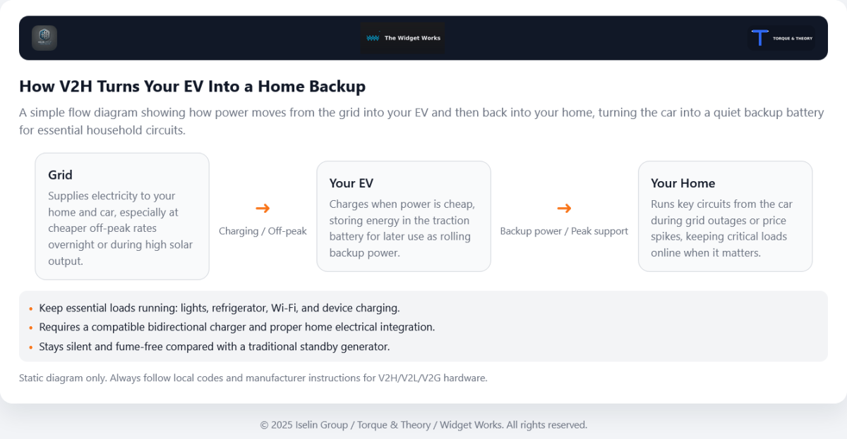 What you are looking at: a simple flow diagram showing how power moves from the grid into your EV and then back into your home, turning the car into a quiet backup battery for essential household circuits.